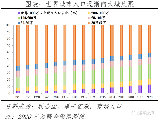 从城市人口占比看,1950-2020年世界1000万以上城市人口占比从3%增至13%,30万以下城市人口占比从60%降至41%。