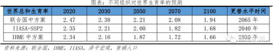 人口预测偏差主要源于历史数据估算的不准确和预测方法的局限,预测人口的关键在于总和生育率的预测,联合国预测总和生育率时没有考虑教育水平的变化,使预测结果大打折扣,其预测世界总和生育率在2065年左右达更替水平(2.1),晚于其他机构;从中国人口数看,一方面联合国对1960、2000、2020年中国过去总和生育率分别高估37.3%、32.8%、30%,另一方面,联合国对未来中国总和生育率的预测较其他组织高20%左右,使得其高估中国人口。第一,历史数据的估算偏差会直接影响对未来预测的准确性,可能会使其高估人口数。《世界人口展望2019》中1950-2020年的人口数据是直接来自各国统计局,其中约一半的地区没有官方人口统计数据,联合国需对难以获取的数据进行估计,对历史数据的估计准确性直接影响对未来预测数据的准确性。第二,预测方法影响预测结果准确性,对生育率的高估使其对人口数高估。联合国人口预测使用贝叶斯分层模型方法,基于人口转变理论对过去各国的生育、死亡、迁移参数分别建模,建立每个参数的概率分布,依据不同国家所处的人口转变阶段以及历史变化轨迹推断未来轨迹。预测人口的关键在于生育率的预测,联合国对生育水平预测基于生育转变理论,使用贝叶斯分层模型并考虑年龄因素对未来生育情况做出预测;IIASA团队人口预测除了考虑年龄外还考虑教育水平因素,并根据 550 多名人口专家的意见,对世界不同地区未来生育率等变量进行假设;IHME团队把教育水平和避孕药使用作为生育的两个驱动因素纳入预测中,并参考联合国可持续发展目标的要求来模拟未来生育水平。从世界人口预测看,联合国、IIASA、IMHE预测世界总和生育率实现更替水平的时间分别为2065年、2040年、2030年左右。从联合国对中国总和生育率的历史估计数看,联合国估计的1960、2000、2020年中国总和生育率分别为5.48、1.62、1.69,而根据国家统计局的数据,分别为3.99、1.22、1.3,分别高估37.3%、32.8%、30%。生育率平均高估30%意味着对下一代的出生人口数要高估30%,对两代人后的出生人数高估69%,对三代人后的出生数要高估一倍以上。从联合国对中国总和生育率未来预测数看,2025、2030、2035年联合国中方案预测中国总和生育率分别为1.7、1.72、1.73,逐渐增加,而IIASA预测均为1.4,IHME预测分别为1.44、1.42、1.42,逐渐递减,可见联合国对中国生育水平存在高估。