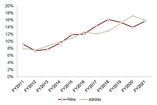 全球几大运动鞋服巨头过去10年的收入也实现了强劲增长,其中Nike、Lululemon的运动服装收入基本稳定在双位数以上,adidas的运动服装也有稳健增长。