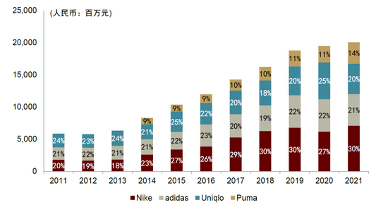 全球运动鞋服市场快速增长,头部品牌收入增长强劲。随着健康生活理念的渗透和全民健身热潮的风靡,运动鞋服行业经历了快速增长期,2021 年全球运动鞋服市场规模达到3,638亿美元,2011-2021年CAGR为3.8%(vs. 整体服装行业CAGR仅0.3%)。Euromonitor预计全球运动鞋服市场未来5年仍将以快于服装行业平均的速度增长。