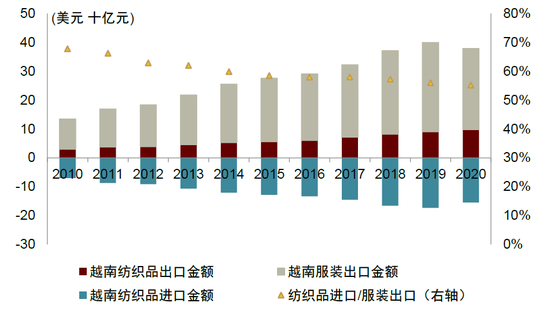 但大部分新兴服装出口国主要从事劳动密集的成衣代工环节,技术积累较深的纺织品制造环节仍较为依赖外购。以纺织制衣产业较为发达的越南为例,截至2020年越南纺织服装出口额占GDP比重约11%。2020年越南服装出口金额281亿美元,占全球比例约6%;纺织品出口金额98亿美元,占全球比例约3%;纺织品进口金额155亿美元,越南大部分中高端面料主要依赖进口,中国是其最大的进口来源国。