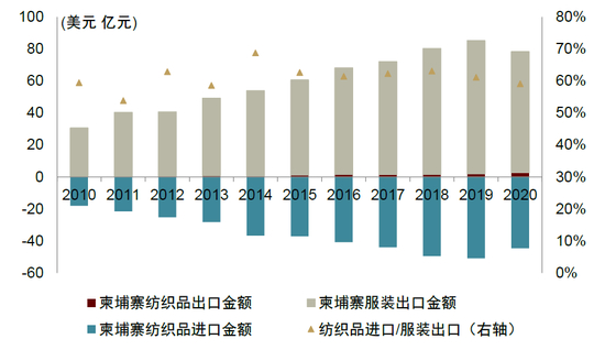 图表:柬埔寨纺织品进口/服装出口比例较高