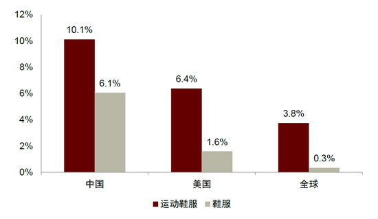 图表:全球及主要市场运动鞋服市场2011-2021年CAGR高于鞋服市场