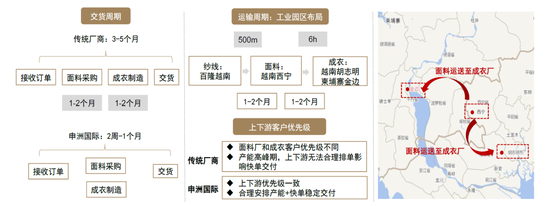 垂直一体化提升供应链效率,提升快速交付能力。服装具备较强的季节性与潮流性,在存量竞争时代,品牌客户对供应商订单按时、按质、按量交付的要求更高,侧重以供应链效率选择供应商。相较于单一环节OEM,申洲将面料和成衣垂直一体化,不涉及外发加工或外部采购,内部控制和协调能力增强,保证平稳、优质的产能交付;垂直一体化也能缩短物流运输、货品检验、用料对接的时间,实现产品快速反应。