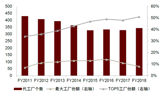 上游OEM厂商数量缩减,呈现集中化趋势。全球运动鞋服需求旺盛,头部品牌订单量持续增长。与此相对,头部品牌合作的纺织制衣代工厂数量却在不断缩减,反映供应链呈现头部化、集中化趋势。