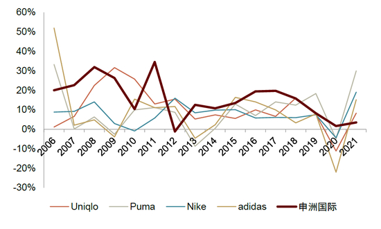全球最大的纵向一体化针织制造商之一。公司主营针织面料和成衣生产,在中国、越南、柬埔寨拥有生产基地,21年生产服装约4.9亿件,下游主要客户包括国际运动及休闲品牌Nike、adidas、优衣库、Puma。疫情前2015-2019年,公司收入、净利润CAGR分别为16%、21%,毛利率稳定在30%左右、净利率稳定在20%上下,拥有行业领先的业绩稳定性和盈利能力。
