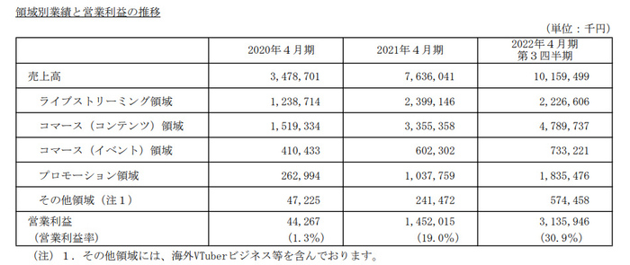 在日本,彩虹社已经是虚拟偶像行业的头部玩家,但它依然十分年轻——2017年成立,目前拥有216名员工,员工平均年龄30.2岁。这家成立并不算久的公司,进入第五个财年,彩虹社前三个季度(自然年2021年5月1日-2022年1月31日)的营业收入达到101亿日元(约5亿人民币),而其2017年4月-2018年5月的第一个财年,收入仅1662万日元,四年多时间营收规模增长600倍。