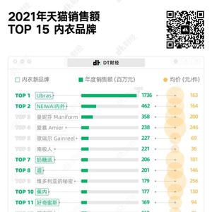 我们查看了2021年天猫销售额前15的内衣品牌,发现Ubras、内外等新品牌、和曼妮芬、爱慕、都市丽人等传统品牌均有上榜。