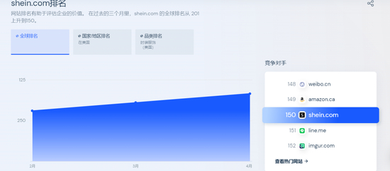 进入2022年,SHEIN官网流量仍然不减。根据Similarweb最新数据分析,shein.com全球排名150,仅次于亚马逊官网。而在美国时装服饰品类网站中,shein.com排名第二。