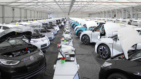 2020年8月,德国下萨克森州雷登镇一处5000平米的帐篷中,120辆大众ID3次列排开,各自连接着一台电脑。这些即将交付的新车正在“刷机”,写入让车辆能正常驾驶的系统软件。