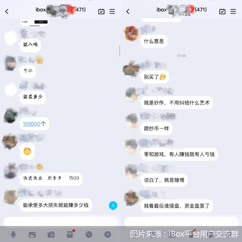 从数十元暴涨至数万元,涨幅动辄达到数百倍甚至千倍,这也让不少用户选择“赌一把”。5月19日,北京商报记者在一个iBox藏品交流群中注意到,不少用户分享了自己的收益情况和交易经验,“快进快出,别贪多”“能承受多大损失就能赚多少钱”。而在谈及相关藏品的实际价值时,有用户直言“就是炒作,不用纠结什么艺术”“就看最后谁接盘,资金盘罢了”。