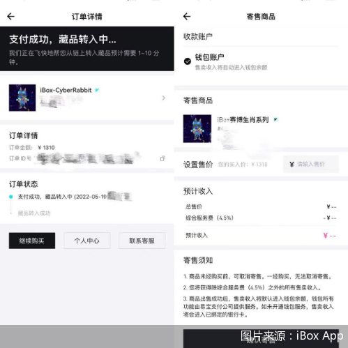 经过进一步绑定银行卡、付款等操作后,该款“iBox赛博生肖系列-兔”到达北京商报记者钱包账户。付款信息页面提示收款方为“易宝支付”。此外,查看数字藏品相关信息时,页面出现“立即寄售”信息,可自行设置售价。