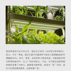 “现在智能种植机这类产品,还需要提高市场认知度”,一家智能种植机公司的负责人刘女士向记者介绍,她公司最初生产智能种植机的思路,是希望有孩子的家庭能为孩子培育放心蔬菜,使用这种产品进行水培种植,可以吃到无公害蔬菜。在此基础上,因为设备外形不错、好操作、懒人模式,才开始拓展年轻人在家种菜的市场以及老年人在城市种菜的市场。
