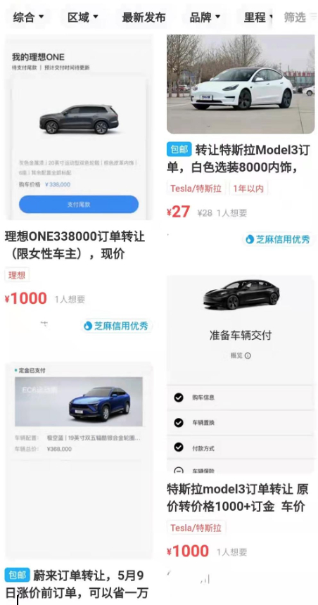 有网友向懂懂笔记透露,目前,在二手电商平台上,有很多商家正在出售新能源车订单。