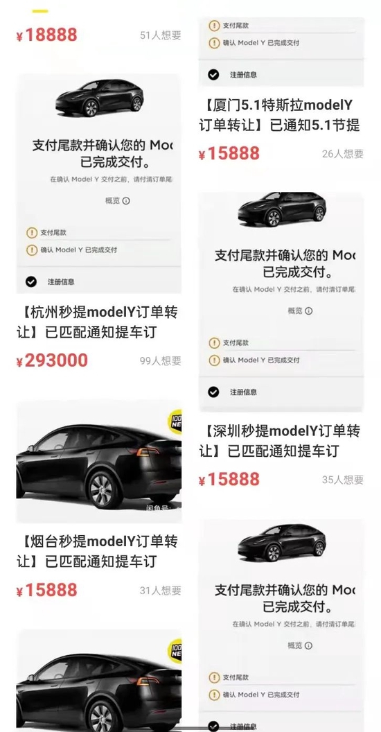 去年12月的特斯拉Model Y 订单,号称受让一周内可以提车,订单转让价居然高达16000元。且平台显示,订单发布短短几天内,已有35人点了“想要”并向商家咨询。