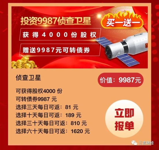最高投资9987元地球资源卫星,可获得4000份股权,9987元可转债券。选择3天收益周期,每日可返81元;选择10天收益周期,每日可返189元;选择30天收益周期,每日可返810元;选择60天收益周期,每日可返1620元。