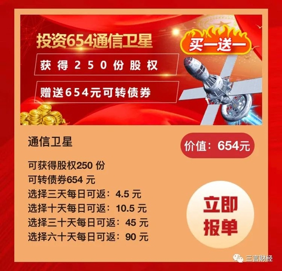 加入“神舟星链计划”,有5个投资门槛。最低为654元通信卫星,可获得250份股权,654元可转债券。选择3天收益周期,每日可返4.5元;选择10天收益周期,每日可返10.5元;选择30天收益周期,每日可返45元;选择60天收益周期,每日可返90元。