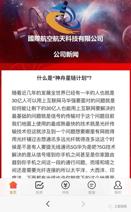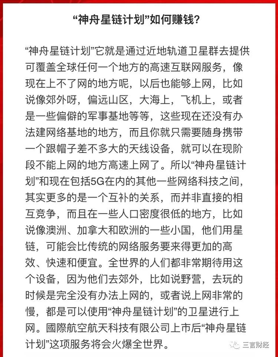 “神舟星链计划如何赚钱?”里,说航空航天科技有限公司上市后“神舟星链计划”这项服务将会火爆全世界,但却并没有说出如何赚钱。