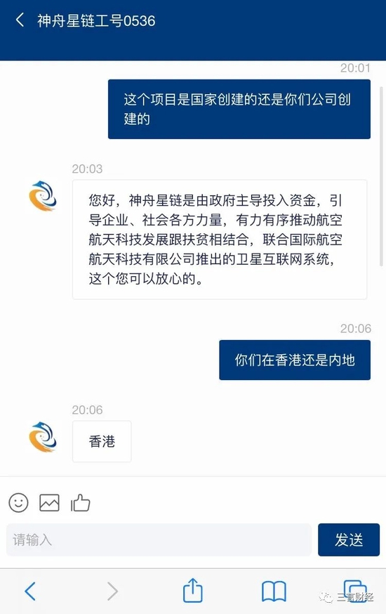 三言财经问该项目是国家创建还是其公司创建,客服称,神舟星链是由政府主导投入资金,引导企业、社会各方力量,有力有序推动航空航天科技发展跟扶贫相结合,联合国际航空航天科技有限公司推出的卫星互联网系统。