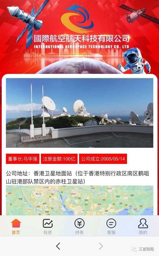 据其网站介绍,国际航空航天科技有限公司创建于2005年5月,注册资金100亿,董事长为马华强。公司地址为香港卫星地面站。