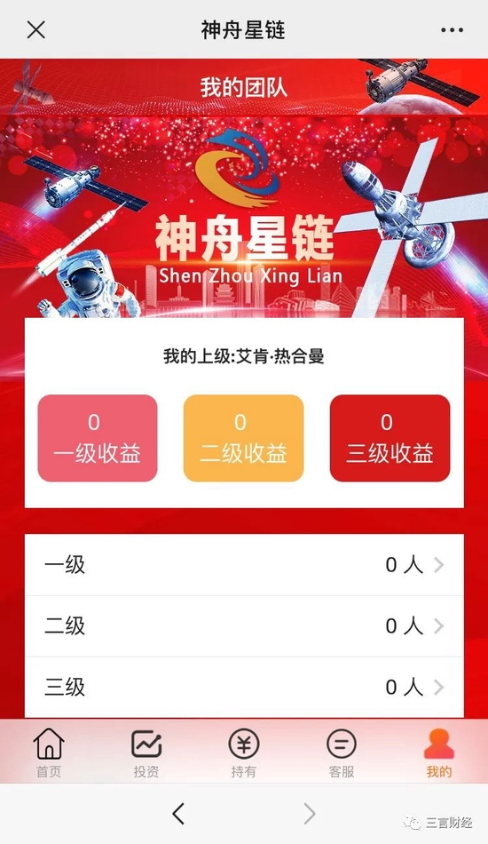 按其说法,假如投资9987元侦查卫星,选择60天收益周期,60天到期后可提现29961+9987元。推荐奖励分三级:一级25%,二级3%,三级1%。
