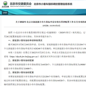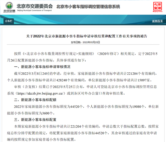 5月25日,《每日经济新闻》记者从北京市小客车指标调控管理信息系统官网获悉,2022年北京市新能源小客车指标申请审核(含复核)结果已经出炉,家庭新能源小客车指标的积分排序入围名单,以及个人和单位新能源小客车指标的配置结果将于明日(5月26日)公布。