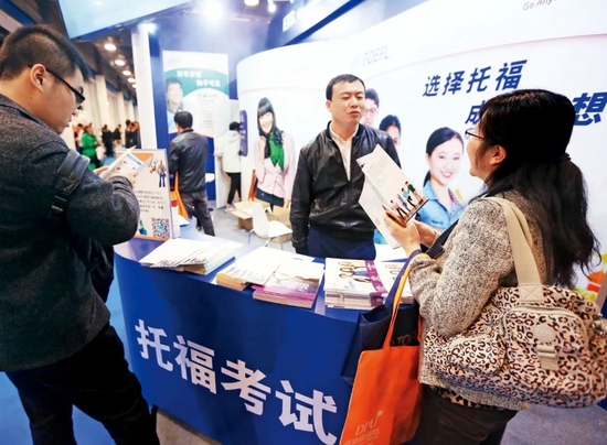 (资料图片)一次国际教育展上,人们在托福考试展台咨询。图/IC