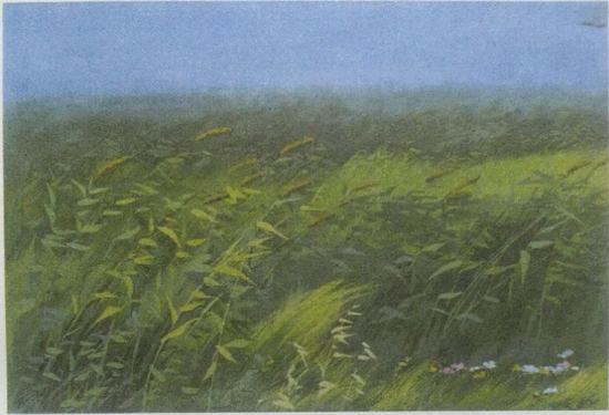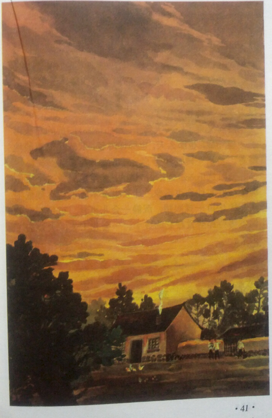 “深蓝的天空中挂着一轮金黄的圆月下面是海边的沙地,都种着一望无际的碧绿的西瓜。其间有一个十一二岁的少年,项带银圈,手捏一柄钢叉,向一匹猹尽力的刺去。那猹却将身一扭,反从他的胯下逃走了。”