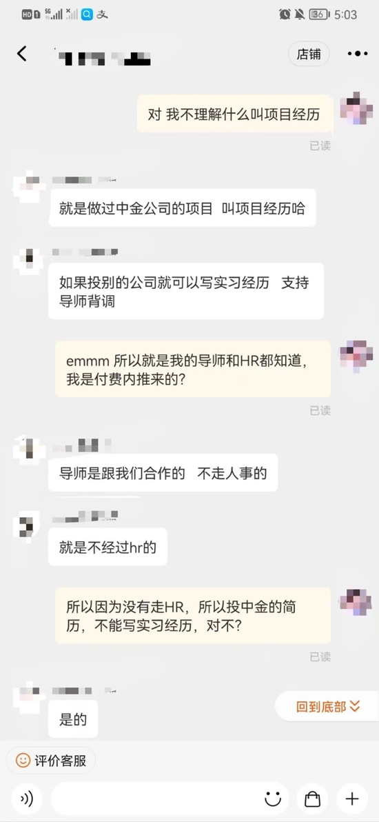 值得注意的是,刘峰特别向红星资本局说明,如果事后学生向券商公司投递简历,“如果投别的公司,简历上可以写成实习经历,导师会配合背调;如果投中金简历上只能写成项目经历,不能写实习经历,因为导师是和我们合作的,不走HR的。”
