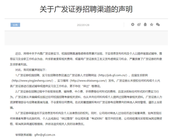 广发券商在声明中还表示,将对候选人过往经历进行背景调查,如有发现任何申请者有意与此类机构、个人达成类似“保过推荐”协议或所谓“考试材料”等文件的交易,公司将视情况采取取消其应聘资格、取消其录用通知等措施。