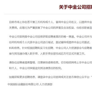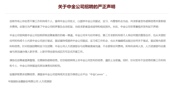 事件发酵后,中金公司发布声明表示,针对校园招聘和实习生招聘,中金公司官网是中金公司目前获取应聘者简历的唯一渠道。中金公司未与任何单位、第三方求职机构或个人有任何简历推荐合作,也从未授权任何机构或个人代表中金公司进行笔试、面试辅导或提供中金公司面试、实习或工作机会,也从未编辑或出版过任何关于笔试、面试等内部资料和信息。中金公司人力资源部会与应聘者直接沟通,不会索取任何费用。所有拟录用人员,人力资源部均会直接与其沟通办理入职手续,入职手续全部完成后方可正式开展工作。