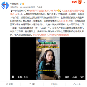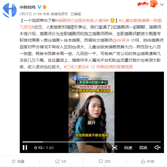 】#儿童出版类插画一张图几百元#近日,人教版教材插图引争议,我们邀请了2位插画师一起聊聊,插画师木城介绍,插画师分为全职插画师和独立插画师两种,全职插画师薪资大概是专职游戏原画>商业插画>绘本插画。而据独立插画师@KK辰未 介绍,自由插画师因面对甲方情况不同收入区别也很大,儿童出版类插画预算大约一两百到七八百一张图,畅销书预算会高一些,几百到一千,而各类广告公司的商业插画通常几百到几万不等。在此基础上,插画师本人曝光平台和粉丝流量对报价也有很大影响,收入波动也比较大。#三问人教社#
