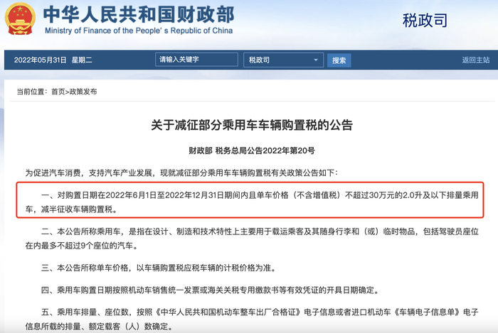 5月31日,财政部、税务总局发布《关于减征部分乘用车车辆购置税的公告》(下称《公告》)。《公告》称,为促进汽车消费,支持汽车产业发展,对购置日期在2022年6月1日至2022年12月31日期间内且单车价格(不含增值税)不超过30万元的2.0升及以下排量乘用车,减半征收车辆购置税。