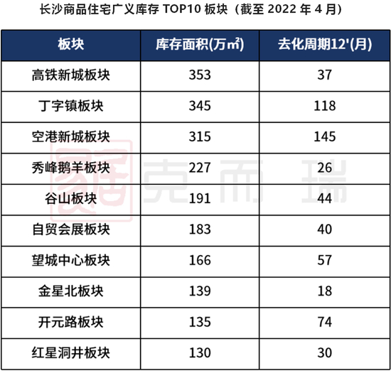克而瑞数据则显示,截至2022年4月,长沙六区一县商品住宅广义库存4938万平方米,按照近12个月去化速度计算,去化周期约31个月,超过18个月的警戒线。[3]