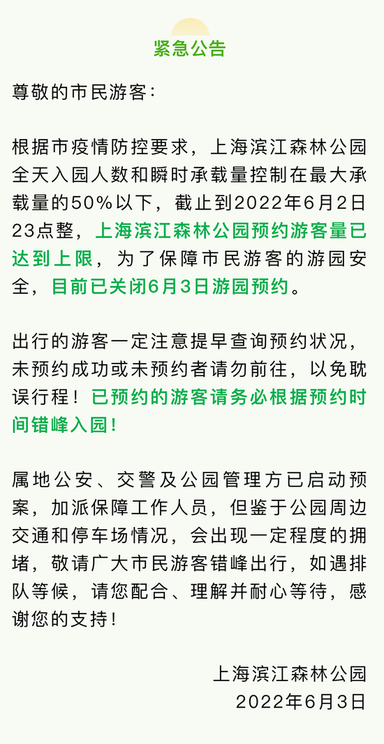 上海滨江森林公园6月3日发布公告称,上海滨江森林公园全天入园人数和瞬时承载量控制在最大承载量的50%以下,截至2022年6月2日23点整,上海滨江森林公园预约游客量已达到上限,为了保障市民游客的游园安全,目前已关闭6月3日游园预约。