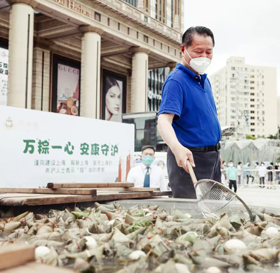 上午11点,月星集团(环球港母公司)董事局主席丁佐宏将首批出锅的粽子以及如皋当地的鸭蛋、土鸡蛋,亲手发给排起长队的人们。他们都是外地来沪的城市建设者和奋斗者,有卡车司机、有快递小哥、有社区工作者、有工地施工人员、有创业者等。
