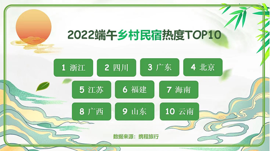 旅游热门目的地在端午期间同样也是乡村民宿订单量最多的地区。携程数据显示,今年端午乡村民宿订单量最高的10个省份,浙江排名第一,四川和广东紧接其后。