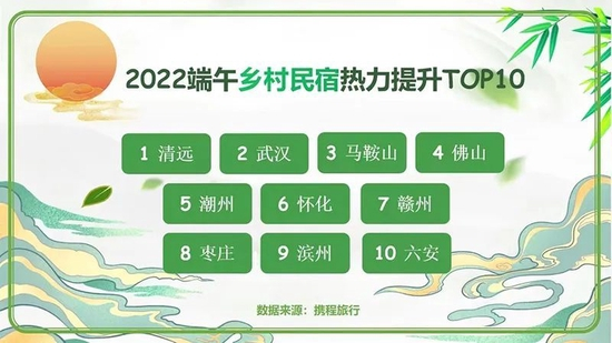 分城市来看,今年乡村民宿热度提升前10的城市中,广东占3席,安徽、山东各占2席。排名第一的广东省清远市,今年端午的乡村民宿订单同比增长高达620%。Top10城市中,半数城市同比增长超100%。
