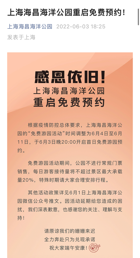 上海海昌海洋公园6月3日发布公告称重启免费预约活动。公告表示,根据疫情防控总体要求,上海海昌海洋公园“免费游园活动“时间调整为6月4日至6月10日,于6月3日晚20:00开启首次免费游园预约,每日限量免费预约5000人次。免费游园期间,公园不进行常规售票,每日游客接待量将不超过景区最大承载量20%。目前,6月4日免费预约名额已告罄。