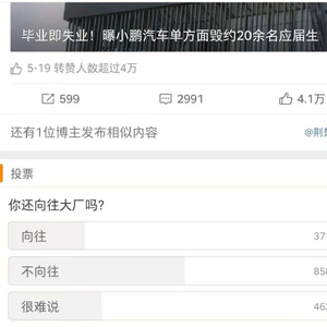 截至目前,新浪热搜话题“小鹏汽车被曝毁约20余名应届生”有1.7亿次阅读,“建议大家珍惜应届生身份”获1.8亿次阅读,热搜中有一项投票,选择“不向往”大厂者是“向往”大厂者的2倍。