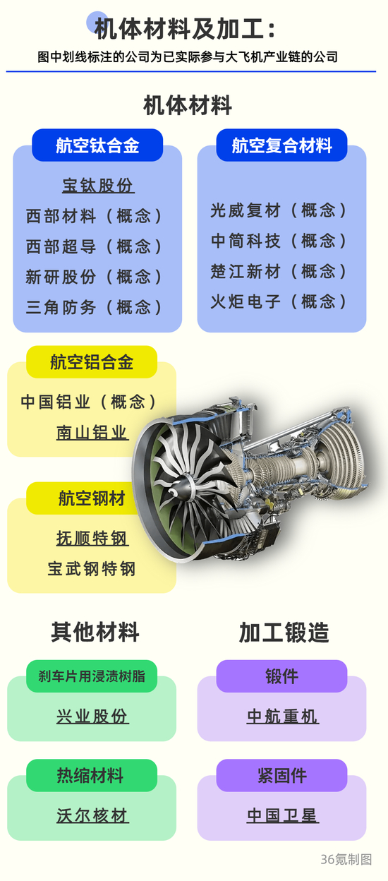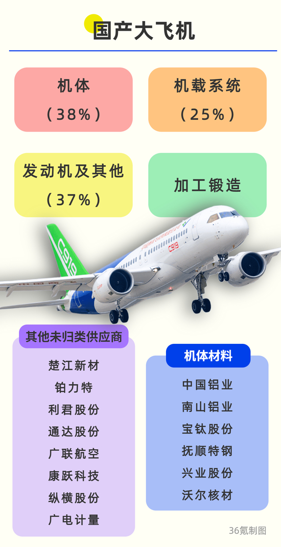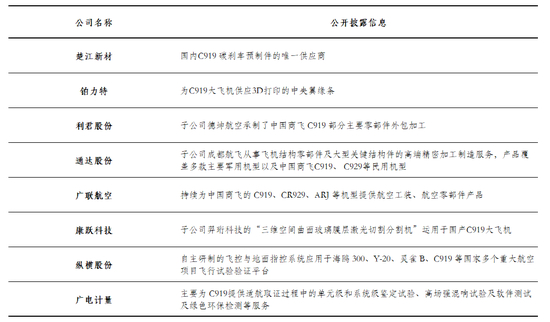 此外,目前A股上市公司公开披露向C919供货的还有楚江新材、铂力特、利君股份、通达股份等企业。
