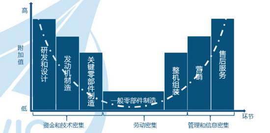 从价值分配的角度来看,大飞机产业链的价值分布呈“微笑曲线”状。位于前端的研发设计与后端的运营服务附加值最高;中段的飞机制造环节,发动机、关键零部件、航空材料高端制造同样有不错的附加值,而一般零部件制造和飞机组装的价值量则最低。