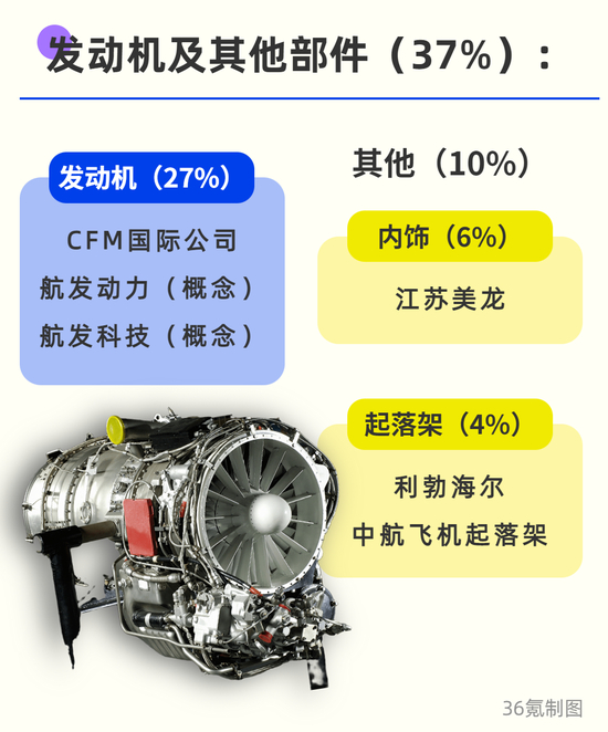 飞机主要由机体、机载系统、发动机及其他零部件四大部分组成,根据国信证券数据,各部位在整机中的价值量依次约为38%/25%/27%/10%。