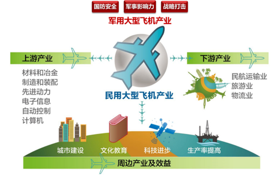 根据招商证券,以美国为例,一架波音飞机的零部件,由全球1600余家企业负责生产,带动70多个工业产业和行业的技术升级。在研发阶段,每投入1美元的研发经费,其综合收益高达34美元;在量产阶段,关联产业对美国经济的贡献率是飞机生产直接效益的15倍。