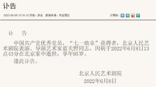 6月8日13点43分,中国共产党优秀党员,“七一勋章”获得者,北京人民艺术剧院表演、导演艺术家蓝天野同志,因病在北京家中逝世,享年95岁。