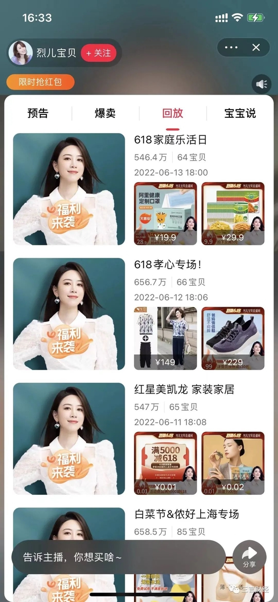 烈儿宝贝目前有超2000万粉丝,她六月共直播了10场,几乎是日播,场均观看人次超过600万。
