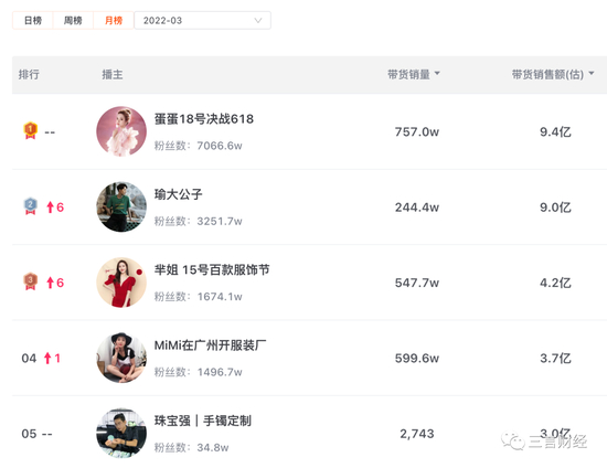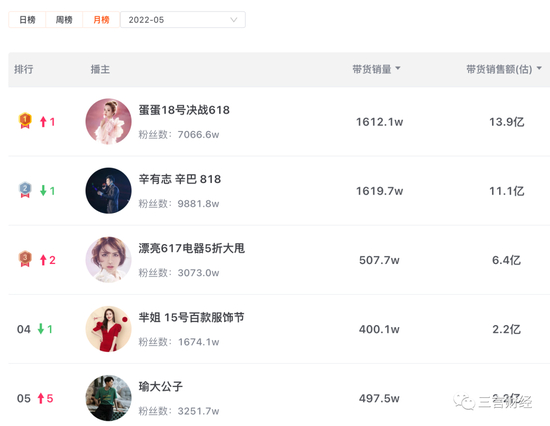 从销售额月榜来看,3月第一名是蛋蛋;4月前两名为辛巴、蛋蛋;5月前三名为蛋蛋、辛巴、时大漂亮。