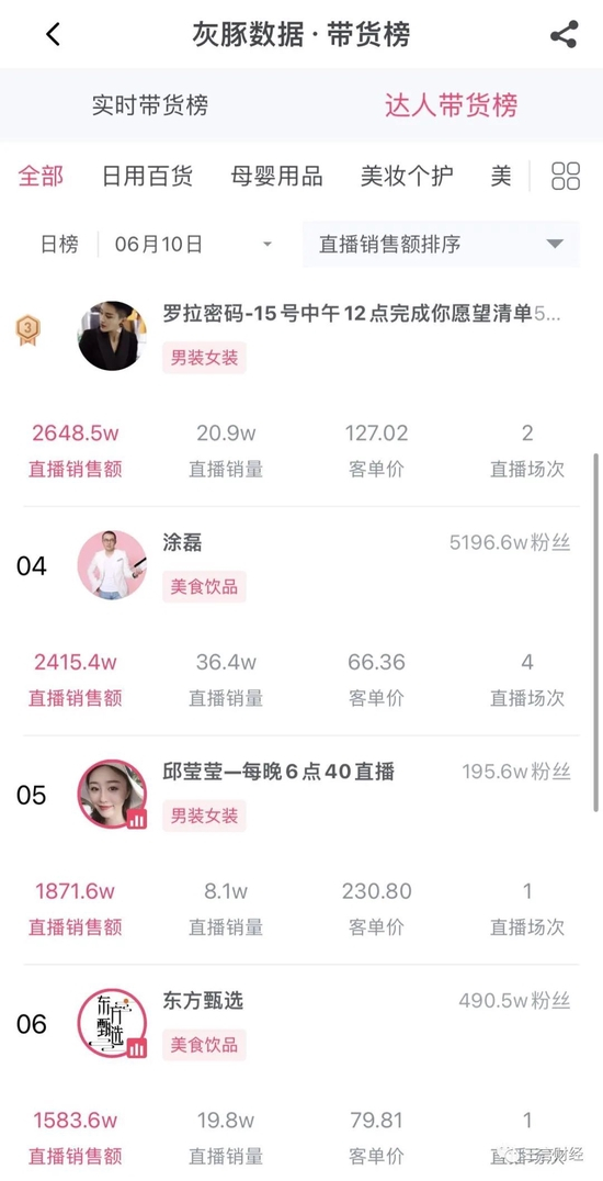 另外在6月的前两周的周榜中,除了贾乃亮、交个朋友、新疆珠宝玉石业这些在月榜里出现的外,广东夫妇则在这两周的销售额都排名第一。