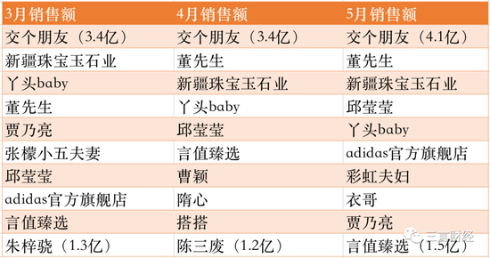从月销售额来看,交个朋友依然牢牢占据第一的位置,其3、4、5月的月销售额都超过3亿。