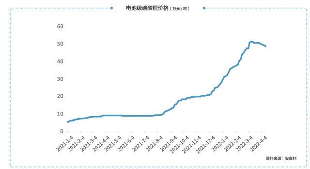 根据安泰科数据,2021年1月初工业碳酸锂价格为4.8万元/吨,2022年6月初工业碳酸锂价格为44.5万元/吨,区间涨幅为827%;2021年1月初电池级碳酸锂价格为5.15万元/吨,2022年6月初电池级碳酸锂价格为46.75万元/吨,区间涨幅为808%。